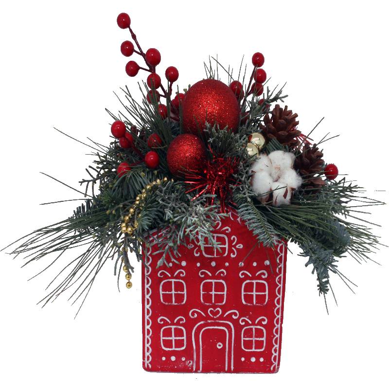 Ενα κεραμικό σπιτάκι γεμάτο αγάπη Έλατο Νορμανδίας και χριστουγενιάτικα διακοσμητικά στολίδια