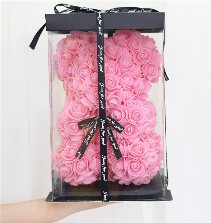 Αρκουδάκι από συνθετικά τριαντάφυλλα ύψους 25 εκ σε κουτί χρώματος ροζ