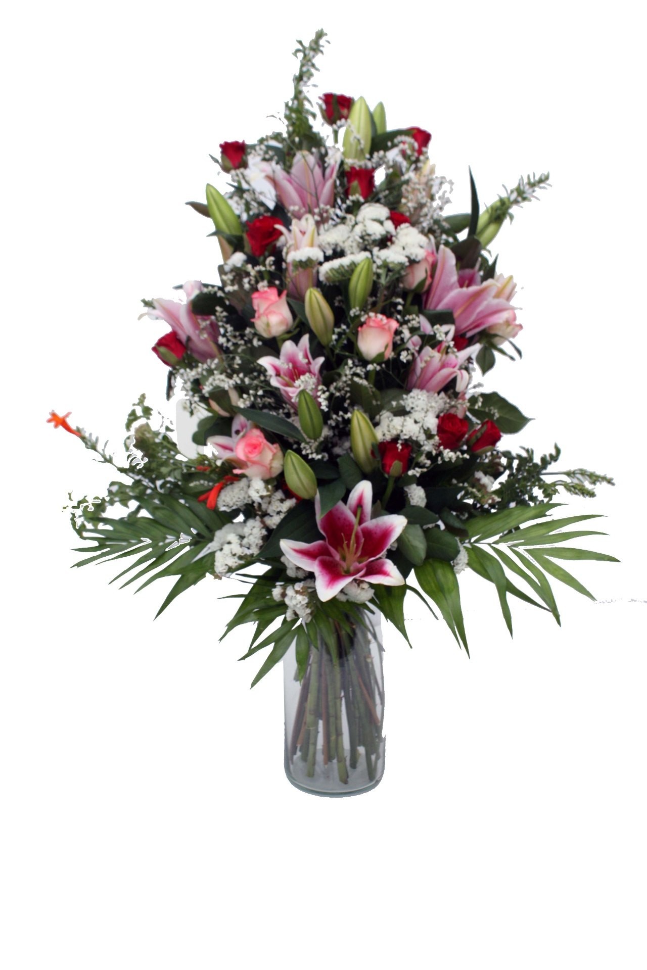 Impressive bouquet with 11 red roses, 7 pink roses and 5 oriental pink plus some leaves . A special bouquet for special occasions.