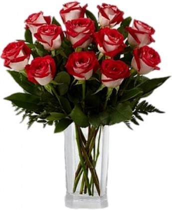 24 velvet bicolor roses, white and red, with leaves.