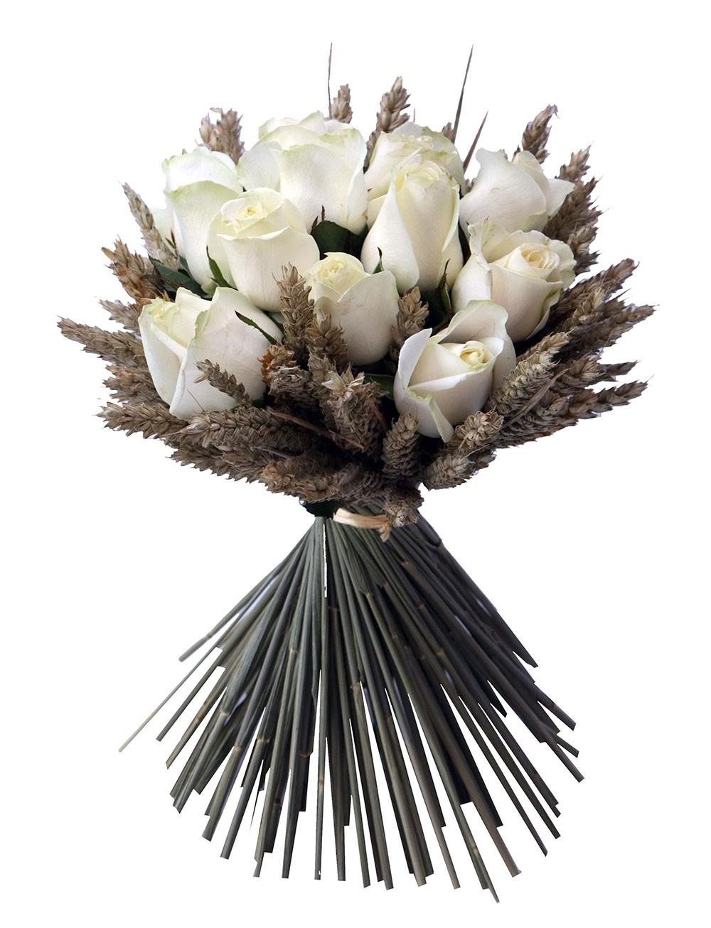 Buquet with ears of wheat and twelve fresh roses. For deliveries outside Heraklion the buquet packaging includes carton box specifically designed to protect flowers during delivery. The arrangement arrives in a water filled travel container, so that the flowers stay hydrated.