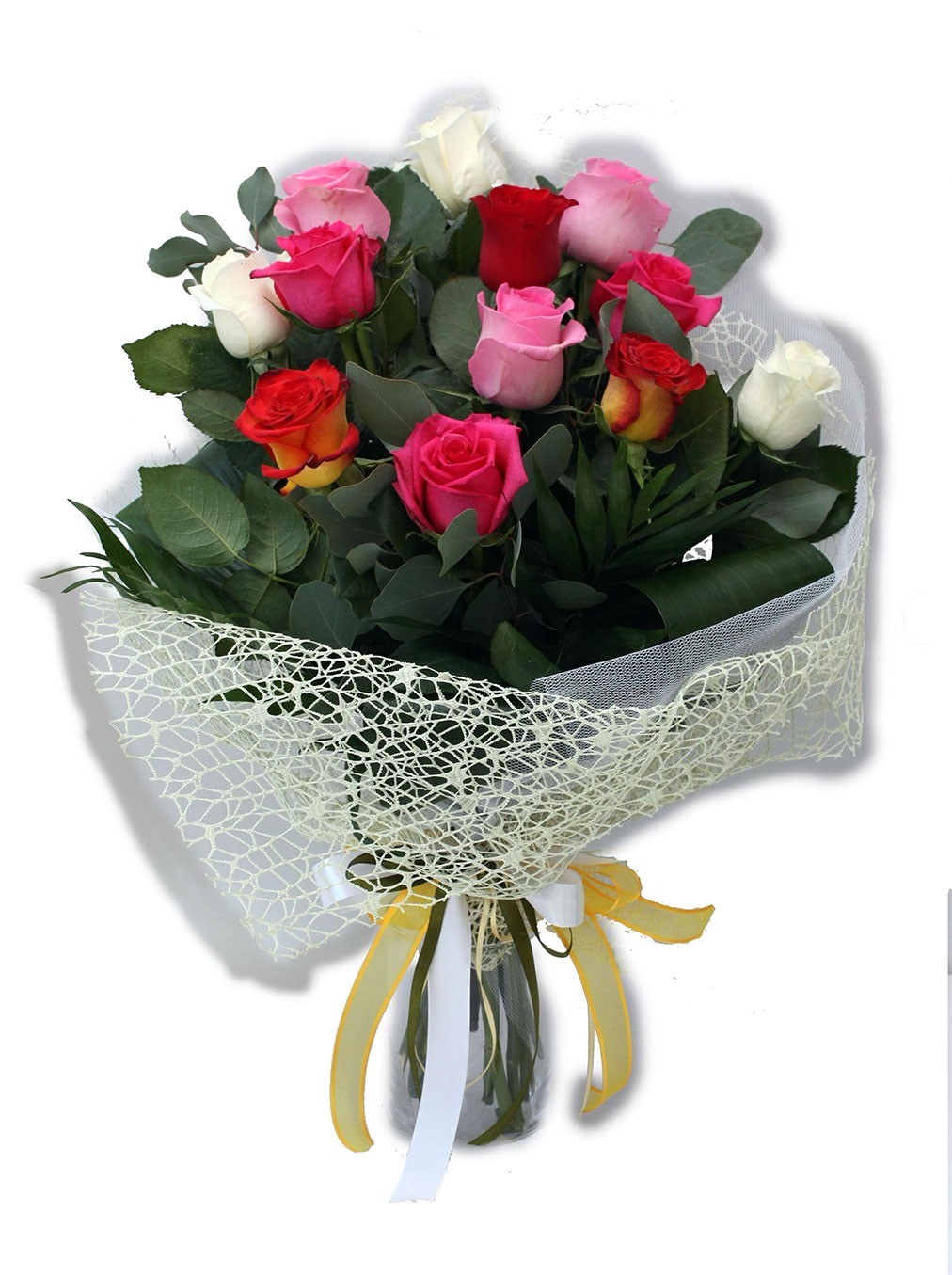 Twelve stems of mix coloured roses. Folliage will complete this buquet beautifully wrapped in matcing paper and ribbons. For deliveries outside Heraklion the packaging includes carton box specifically designed to protect flowers. The arrangement will arrive in a water-filled travel container, so that the flowers stay hydrated.