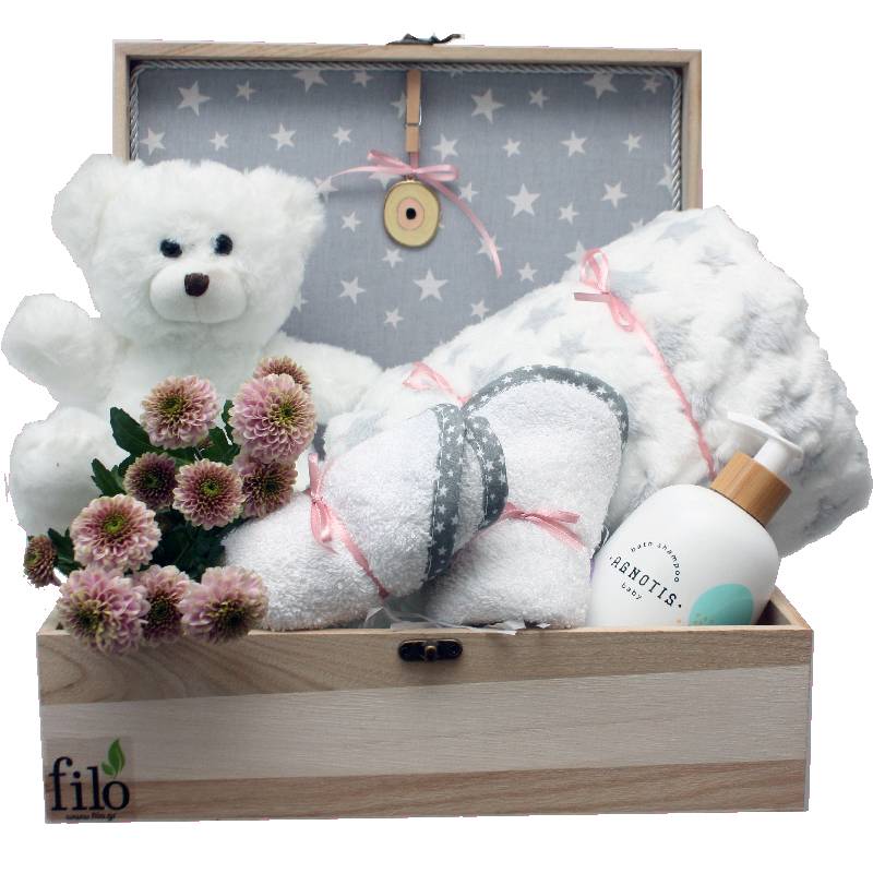 Wooden box containing fleece blanket, white teddy bear and baby bath foam. A small bouquet and a pendant complete the decoration