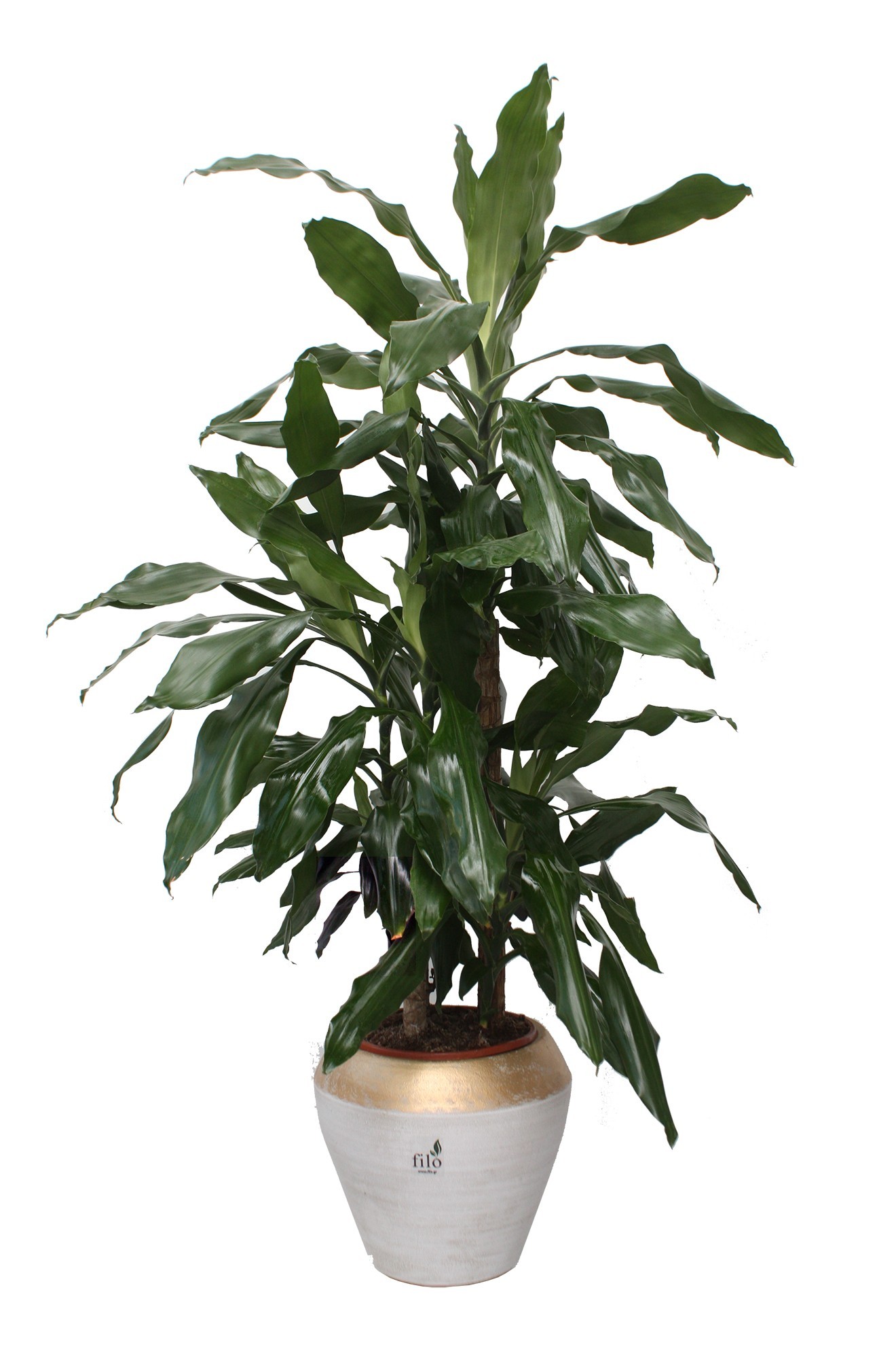 Dracaena steudneri in a luxurious white-golden ceramic pot. It sure fills your space with its rich wide bright leaves. It has air cleaning properties and is quite easy to maintain!