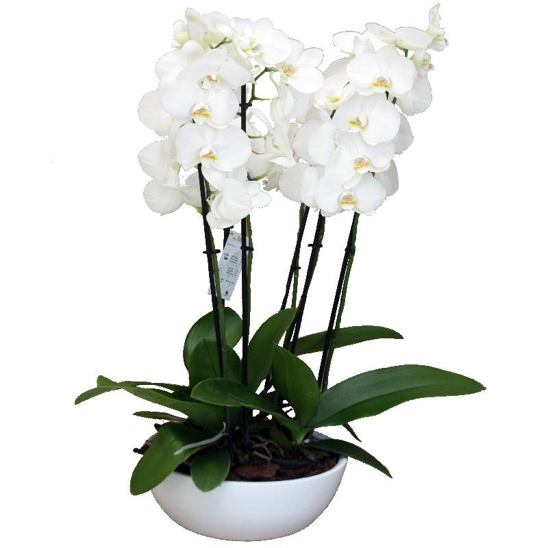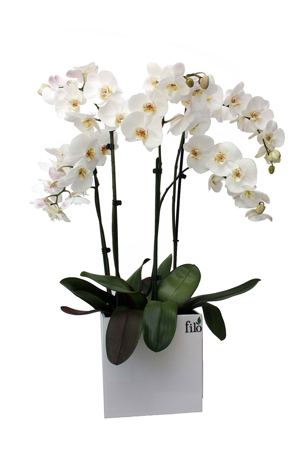 Three double stemmed phalaenopsis orchids (6 stems) with richly flowering in large ceramic cube of excellent quality. Dimensions of the pot 20x20x20 cm.(8x8x8 inches) Total height 1 meter (40 inches)