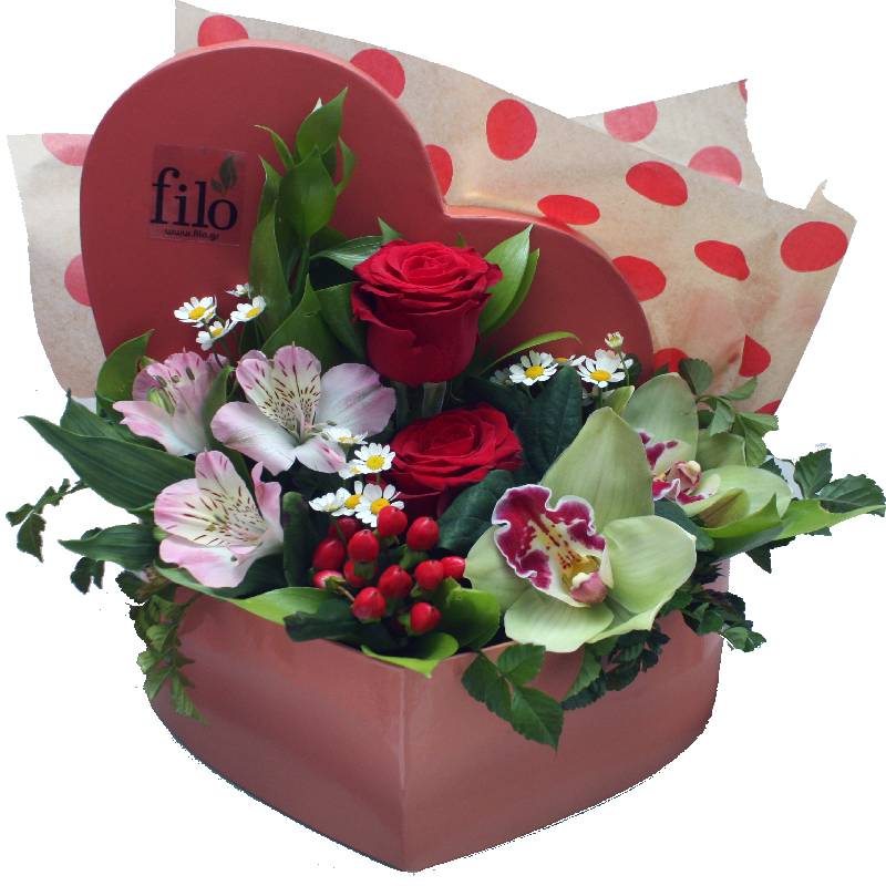 Flower arrangement with roses and a variety of flowers in a heart shaped box!